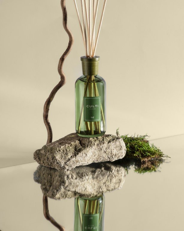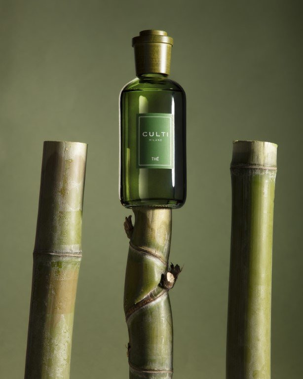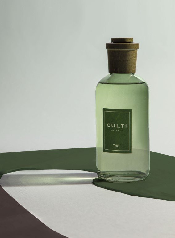 Der runde, grüne Flakon der Colours-Linie unterstreicht die frische, klare Ausstrahlung von Thé und setzt einen natürlichen Akzent im Raum.