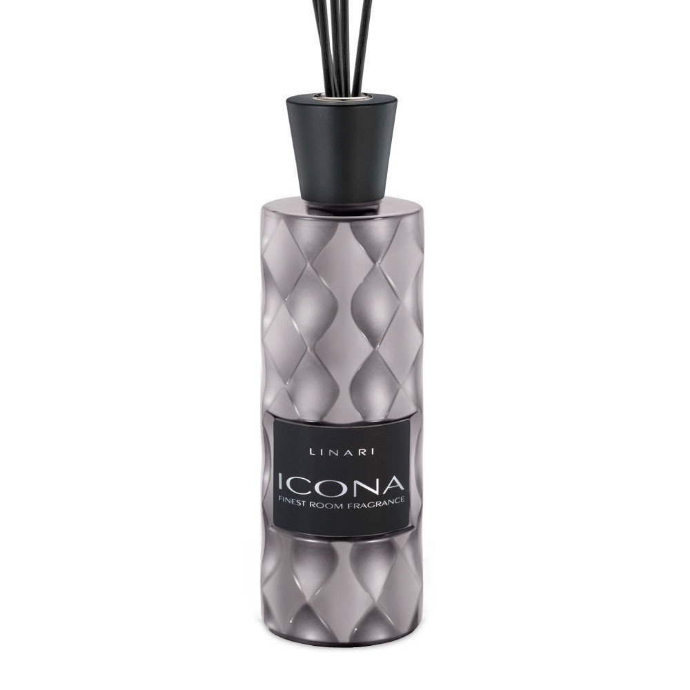 Der LINARI-ICONA Diffusor besticht durch seinen hochglänzenden, edelstahlfarbenen Flakon im opulent-dreidimensionalen Rautendekor, das die scheinbar konträren geometrischen Formen des runden Flakons mit den eckigen Rhomben verschmelzen lässt. Im Kontrast zur hochglänzenden Glasoberfläche stehen der puristisch-matte, tiefschwarze Schraubdeckel aus massivem Ahornholz sowie die Etikette mit innovativer Soft-Touch-Oberfläche und feiner Glanzprägeschrift. Abgerundet wird der avantgardistische Look durch die Verwendung exklusiver schwarzer Kapillarstäbchen.